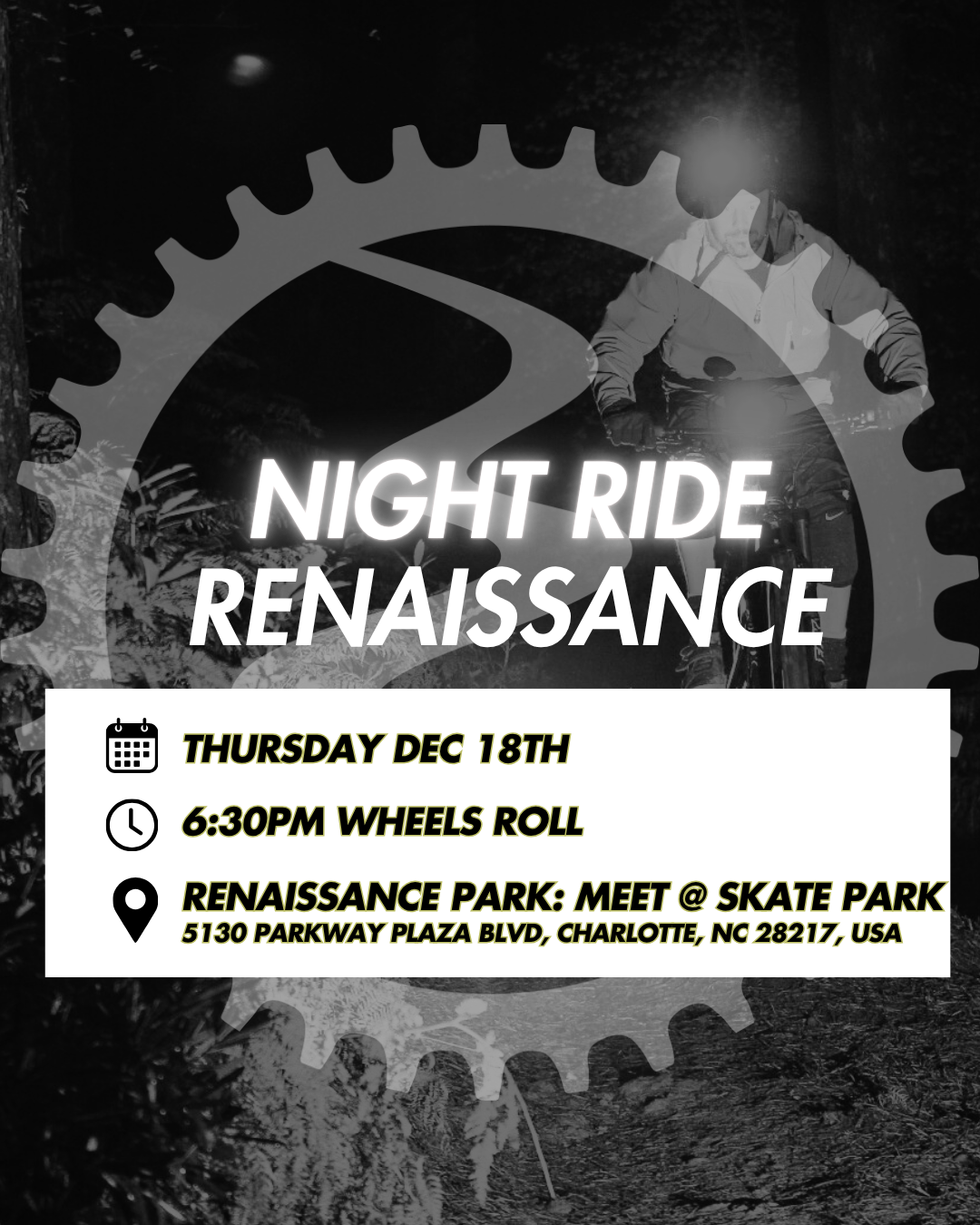 Renaissance Park 5130 Parkway Plaza Blvd, Charlotte, NC, United StatesIt’s nearly the shortest day of the year, so it’s the perfect time for a NIGHT RIDE! Come out and have fun riding Renaissance in the dark - it’s a