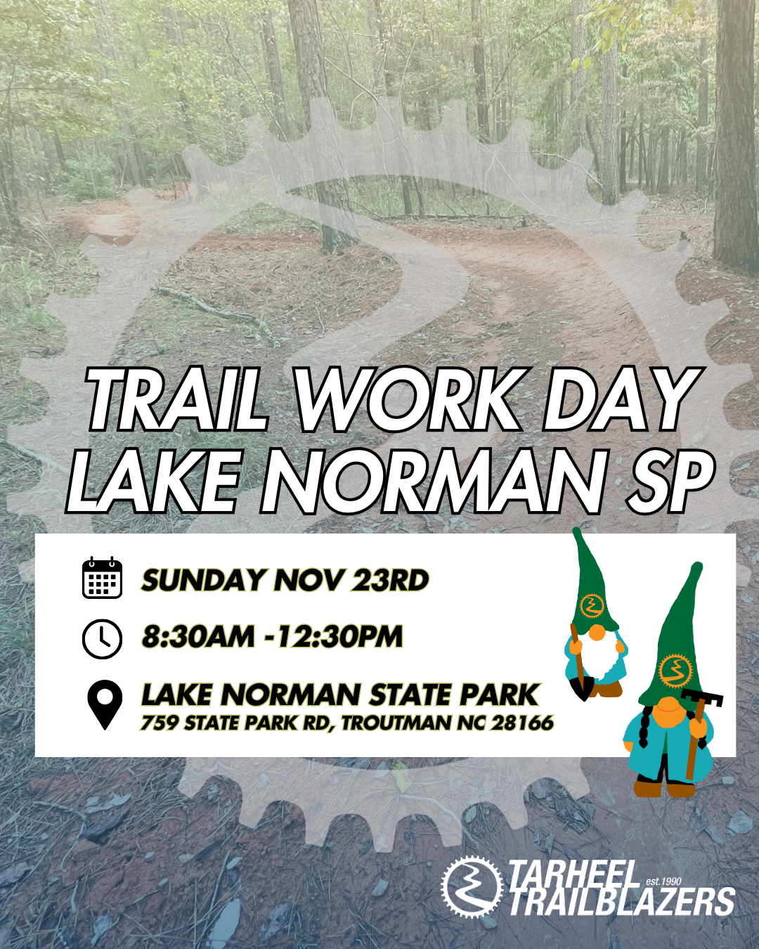 Lake Norman State Park 759 State Park Rd, Troutman, NCJoin us to help get the Lake Norman State Park trails in good shape to stay open as much as possible for the winter riding season. Our primary mission will